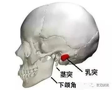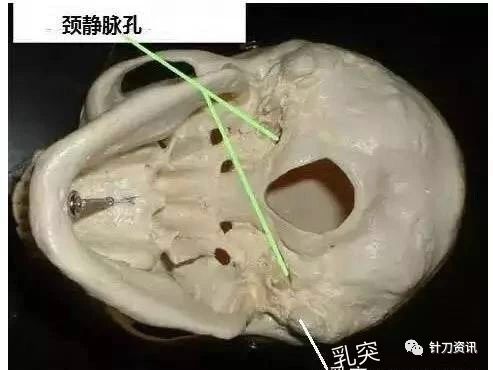 方法二:也可在乳突尖端与下颌角之间连线的中点垂直进针刀至颈静脉孔
