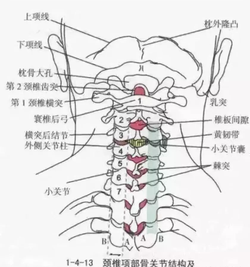 ①项部AB线间区带——关节突关节区(外 侧关节柱)——相对安全区带(图1-4-13 )
