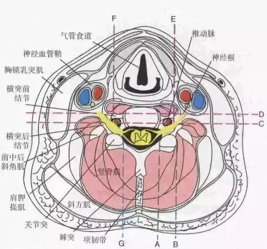 ⑤E线与F线通过颈前部横突前结节外缘 的矢状线。
