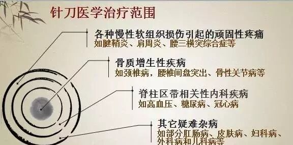 针刀疗法是一种介于手术方法和非手术疗法之间的闭合性松解术。是在切开性手术方法的基础上结合针刺方法形成的。针刀疗法操作的特点是在治疗部位刺入深部到病变处进行轻松的切割,剥离有害的组织,以达到止痛祛病的目的。其适应证主要是软组织损伤性病变和骨关节病变。针刀疗法的优点是治疗过程操作简单,不受任何环境和条件的限制。治疗时切口小,不用缝合,对人体组织的损伤也小,且不易引起感染,无不良反应,病人也无明显痛苦和恐惧感,术后无需休息,治疗时间短,疗程短,患者易于接受。