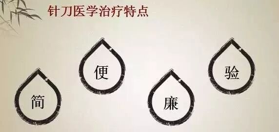 前国家卫生部长张文康部长的对针刀的评语,将针刀疗法的特点归纳为四个字:简(单)、便(利)、廉(价)、(灵)验,生动地体现了针刀疗法的特色及优点。针刀疗法是一种闭合性手术,与针灸相似,不流血、恢复快、无疤痕、无后遗症,立竿见影、标本兼治、一劳永逸。