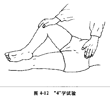 d. “4”字试验阳性:“4”字试验操作方法:患者仰卧,一侧下肢伸直,另侧下肢以“4”字形状放在伸直下肢近膝关节处,并一手按住膝关节,另一手按压对侧髂嵴上,两手同时下压。下压时,骶髂关节出现痛者,并且或者曲侧膝关节不能触及床面为阳性。