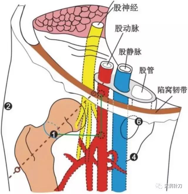 ①大转子下缘点与腹股沟韧带中点的连线是股骨颈中轴的投影线(注意须去除皮肤与皮下组织的厚度),取此线的中点是为进入股骨颈关节囊的安全捷径,而且此处会有显著的压痛。