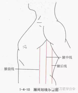 、在胸部、背部、腹部、臀部及四肢均有相应 的人为标线分区(图1-4-09-10)。一则体现内部 器官相对的体表投影位置,二则可做体检时的记 录标志。对于针刀闭合型手术来说,这些标志也 是十分有意义的。对于皮肤相对应的器官不仅要