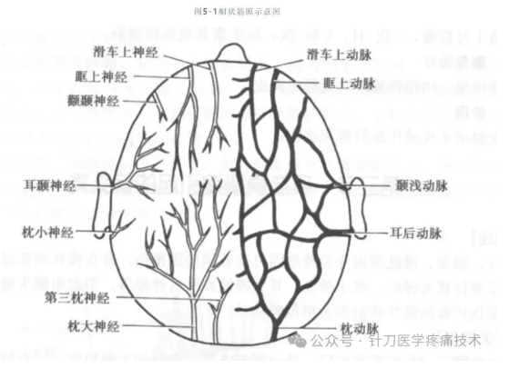 帽状筋膜紧临头部皮下,由致密的结缔组织与脂肪组织构成,并通过许多结缔组织小梁将脂肪组织分成无数小格,内有血管及神经通过。具体分为前组:距正中线2cm处有滑车上动静脉和滑车上神经,距正中线2.5cm处有眶上动静脉和眶上神经。后组:行于枕区的枕动静脉和枕大神经(图5-1,5-2)。帽状筋膜将皮肤帽状腱膜紧密相连共同构成不易分层剥离的“头皮”,因而在维持头部表面正常结构上具有重要作用。