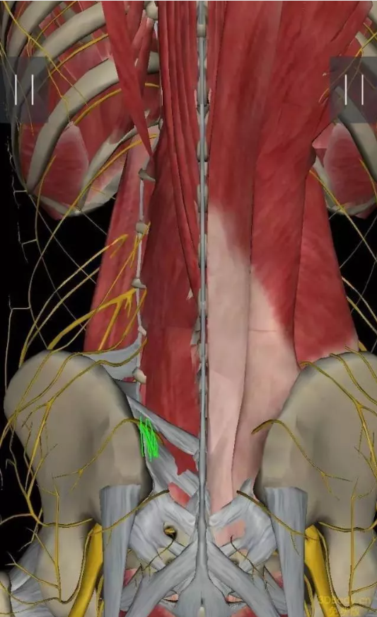 3.坐骨棘:坐骨棘内侧为骶棘韧带,与骶骨外侧、坐骨大切迹共同围成坐骨大孔;其上中下分别有上孖肌、闭孔内肌、下孖肌附着。坐骨神经由坐骨棘的上、外侧,紧贴上述三肌的后面经过。