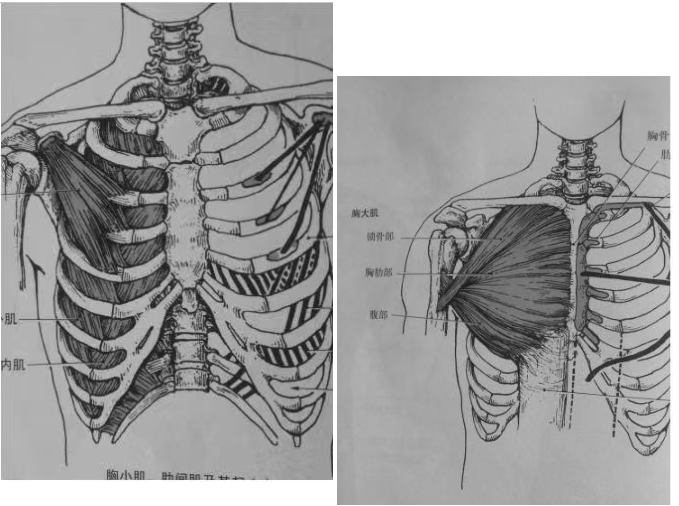 胸大肌起自锁骨内侧半,胸骨和第1~6肋软骨,肌束向外侧集中,止于肱骨大结节嵴。近固定,使上臂在肩关节处屈,内收、旋内和屈。远固定,上肢上举后固定时,可拉引躯干向手臂靠拢,提肋助吸气。胸小肌位于胸大肌深面,呈三角形。起自第3~5肋骨,止于肩胛骨的喙突。作用是拉肩胛骨向前下方。当肩胛骨固定时,可上提肋以助吸气。