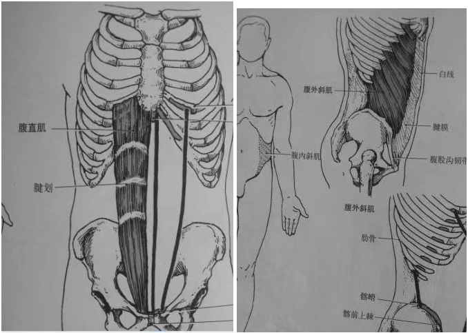 腹直肌起自耻骨联合和耻骨嵴,肌纤维向上止于胸骨剑突和第5~7肋软骨前面。肌的全长被3~4条横行的腱划分成多个肌腹。