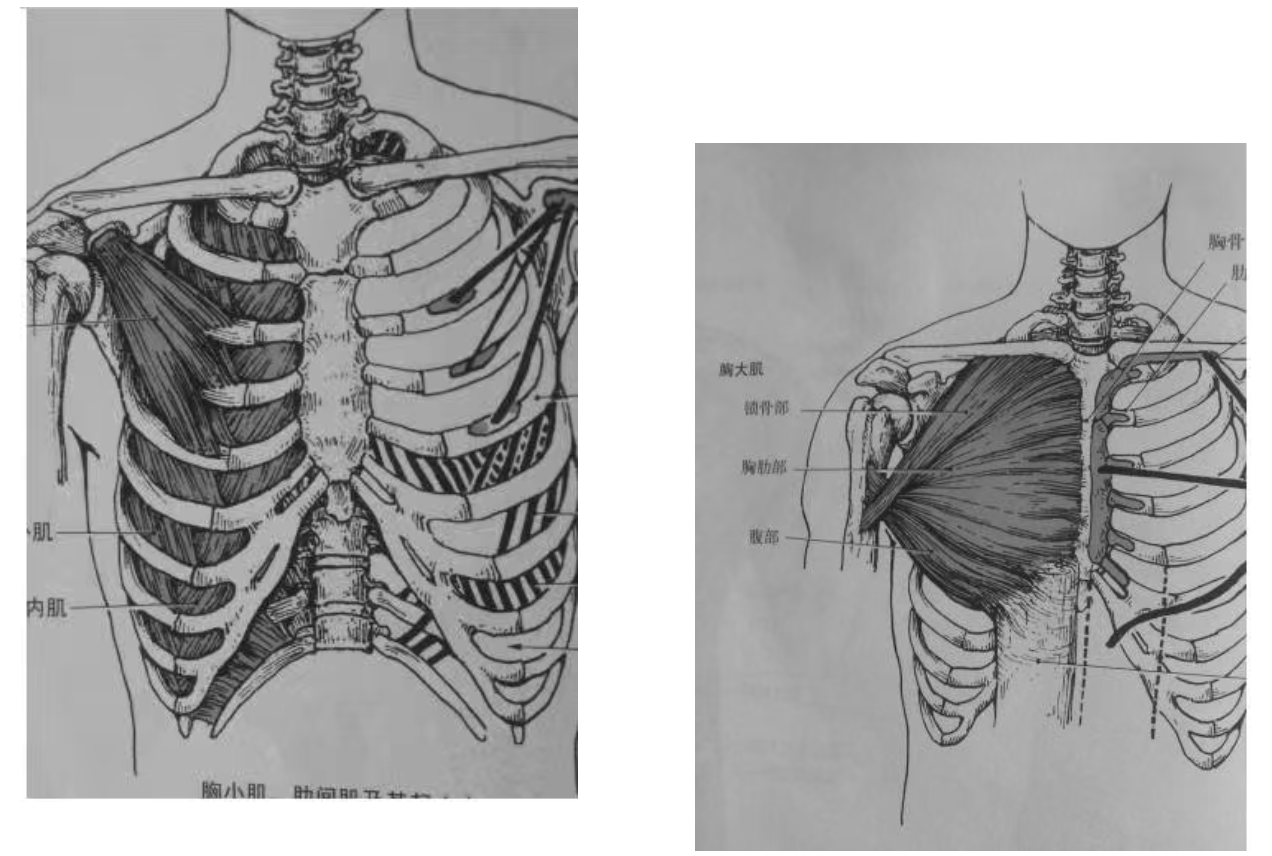 胸大肌起自锁骨内侧半,胸骨和第1~6肋软骨,肌束向外侧集中,止于肱骨大结节嵴。近固定,使上臂在肩关节处屈,内收、旋内和屈。远固定,上肢上举后固定时,可拉引躯干向手臂靠拢,提肋助吸气。胸小肌位于胸大肌深面,呈三角形。起自第3~5肋骨,止于肩胛骨的喙突。作用是拉肩胛骨向前下方。当肩胛骨固定时,可上提肋以助吸气。