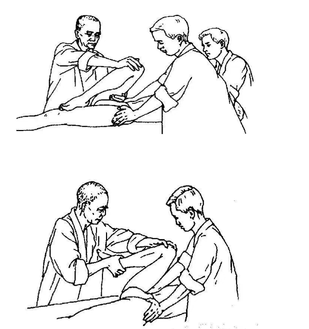 (二)手法:医者一手抵住患侧骶髂关节,一手握持踝部,将足跟压向臀部。在操作过程中,可握住踝部将髋关节同时内旋、下压或外旋、下压,此时常可闻及骶髂关节复位声或手下有滑动感。