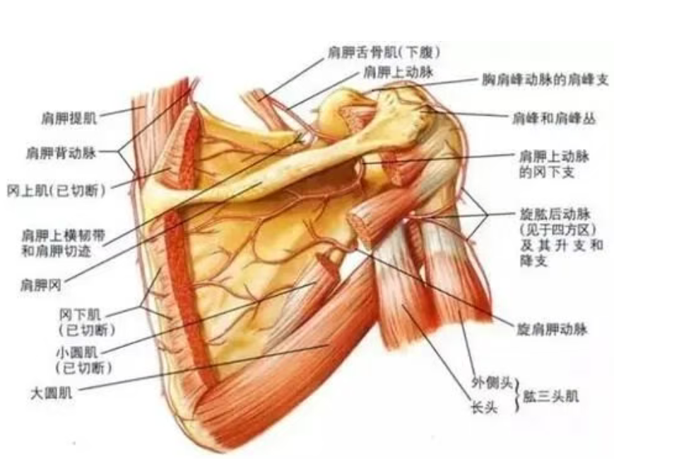 ● 肩胛下动脉的体表定位:在肩胛下肌下缘附近起自腋动脉,走向后下方,主要分为胸背动脉和旋肩胛动脉。前者伴随胸背神经行走,分布于前锯肌和背阔肌;后者迂曲后行穿三边孔,至冈下窝,分支营养附近诸肌。