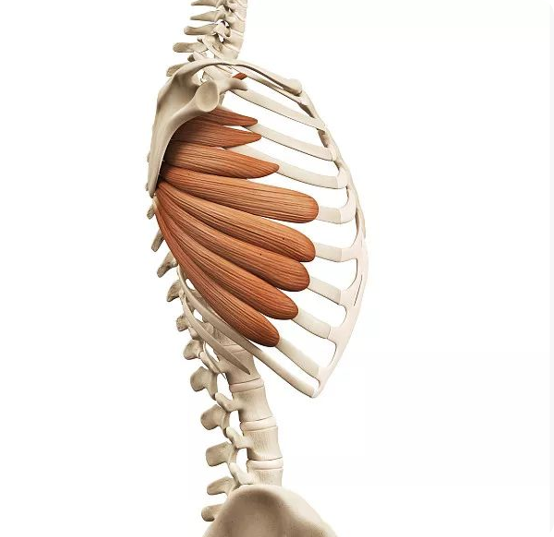 前锯肌沿着胸壁后外侧走行,其斜行的肌纤维从肩胛骨下方的肋骨向其内侧缘延伸。前锯肌大部分位于肩胛骨、背阔肌或胸大肌深面。但前锯肌在腋窝下方的部分比较表浅并容易进入。外展肩胛骨是前锯肌独有的功能,并能拮抗菱形肌。