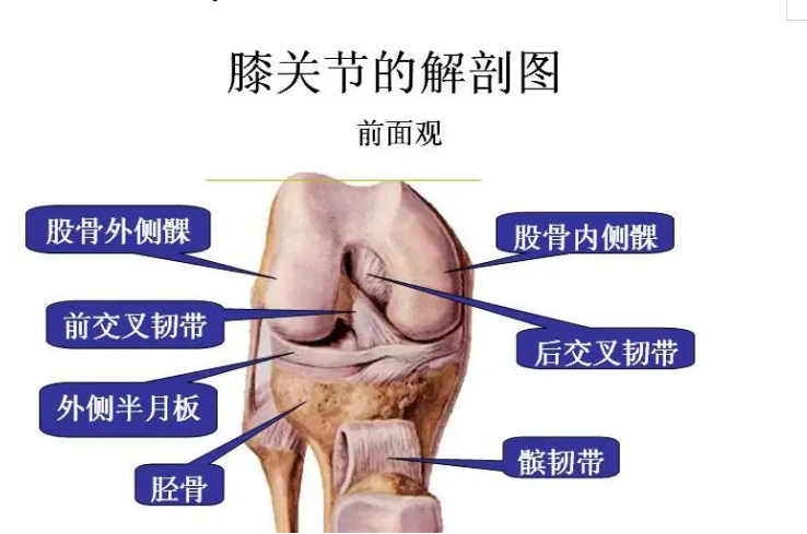 膝关节由股骨髁、胫骨平台、髌骨及其周围滑膜、关节囊、韧带、半月板和肌肉等组织共同构成。外侧髁高,限制髌骨脱位。前后交叉韧带对膝关节的稳定起的作用:前交叉韧带限制胫骨过度前移,后交叉韧带限制胫骨过度后移,两者共同限制膝关节的过伸,胫骨的旋转,限制伸膝位侧方活动。