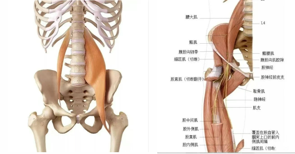 腰大肌起自第12胸椎和五个腰椎及其各横突上,止于股骨小粗隆,在身体的前面才能摸到。腰大肌作用是屈髋,亦协助腹直肌使脊柱向前弯曲。
