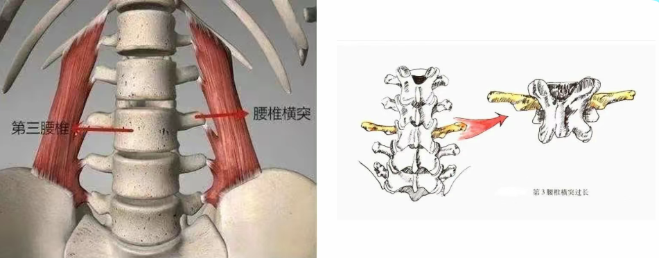 第三腰椎位于腰前凸曲线之顶点,背阔肌的髂腰部分纤维止于第三腰椎横突,腰大肌的部分肌纤维也止于此处,骶棘肌的一部分肌纤维也止于此,因此,第三腰椎成了腰椎的活动中心,起到了类似接力站的作用,为腰椎屈、伸、侧弯及旋体的枢纽,所受的杠杆作用最大。而第三腰椎横突更是受力点。由于第三腰椎横突较长,以致附着于此处的肌肉、筋膜、韧带能有效地保持脊柱的稳定性及正常的活动。较长的横突又能增强肌肉的杠杆作用,肌肉收缩牵拉机会多,拉力最大,当这些组织异常收缩时,横突末端首当其冲。这种解剖特点构成末端易受损伤的基础,往往因劳损而引起横突末端周围的纤维织炎。横突越长,发病率越高,以单侧多见。