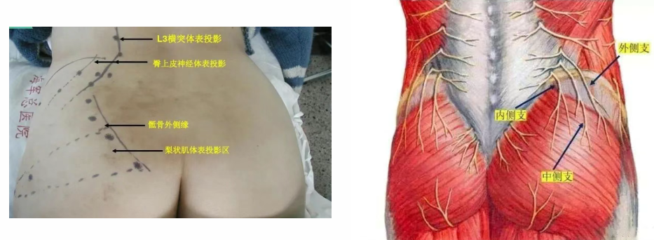 臀上皮神经是由腰1--3脊神经后外侧支组成。第2腰神经的后支紧贴第3腰椎横突顶端尖部向外侧走行,穿过深筋膜从骶棘肌外缘在深浅筋膜之间向下走行,在腰三角处穿过腰背浅筋膜,越过髂嵴分布于臀上部皮下,还有部分纤维入臀中肌和大腿后侧皮下。
