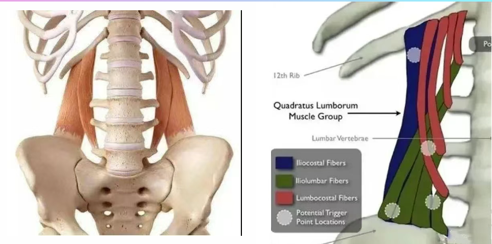 腰方肌大致呈“方形”,位于腰椎两侧,以三组纤维连接在第12肋、腰椎横突和髂嵴之间,和肋骨、腰椎、骨盆都有密切关系,其主要作用是向下牵拉使脊柱侧弯。