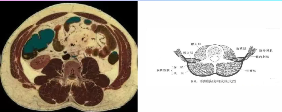 腰椎横突末端附着不少与躯干活动有密切关系的肌肉及筋膜,主要有腹横肌、腰方肌、腰大肌、骶棘肌及腰背筋膜。坚强的腰背筋膜深层附着于腰椎横突末端、季肋及髂嵴,腹横肌移行于腰背筋膜而附着于横突。腹内压的变化可通过腹横肌而影响到横突末端的组织。