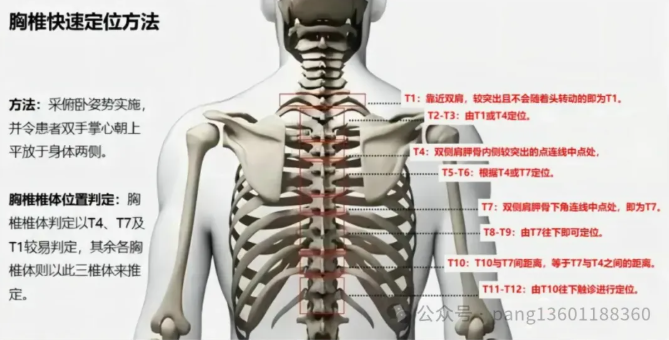 1、棘突,相当于相应脊椎横突与下一个脊椎横突间的水平(例如:T10棘突的中点,相当于T10与T11横突间的水平)。