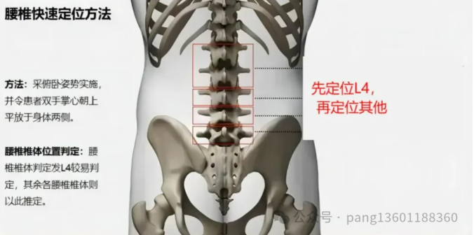 L4棘突:两侧髂嵴最高点连线与背部中线相交处(此种情况占22%,L4-5棘突间者占60%,L5棘突者占8%)。