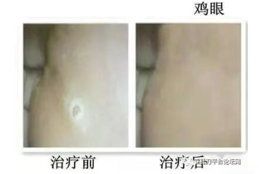术后患足多发鸡眼原有疼痛立刻消失,7-10后天鸡眼逐渐干枯脱落。本组96例病人经针刀微创治疗后,均获一次性治愈,治愈率达100%,随访一年无复发。